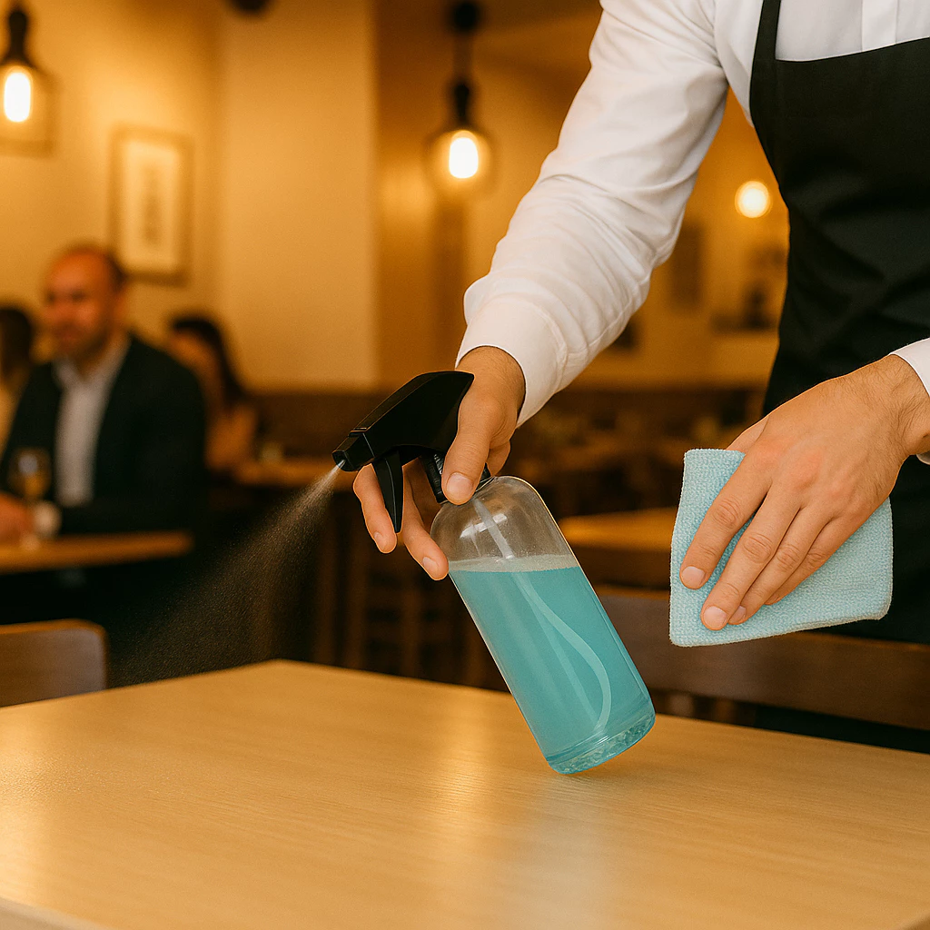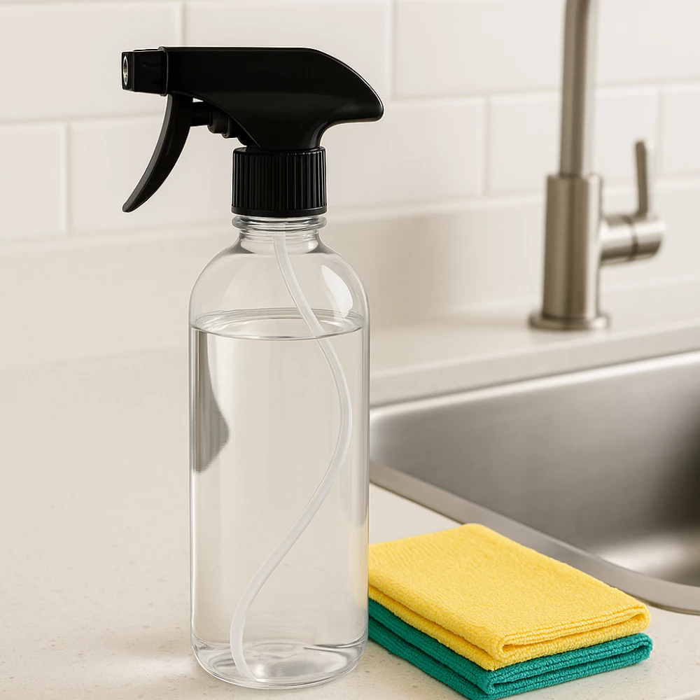 A tampa trigger com bico rotativo oferece três posições funcionais: spray fino para névoa uniforme sobre superfícies, ideal para higienizadores e aromatizadores; jato concentrado para aplicação direcionada em gordura e sujeira pesada, ideal para desengordurantes e limpadores multiuso; e fechado para transporte e armazenamento sem vazamento. O borrifador para limpeza com trigger é o formato que comunica profissionalismo — mesmo sendo produção artesanal, a embalagem transmite controle e qualidade.