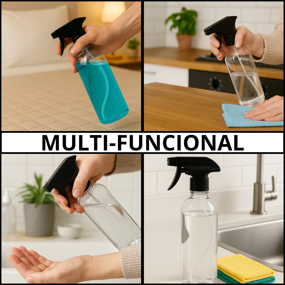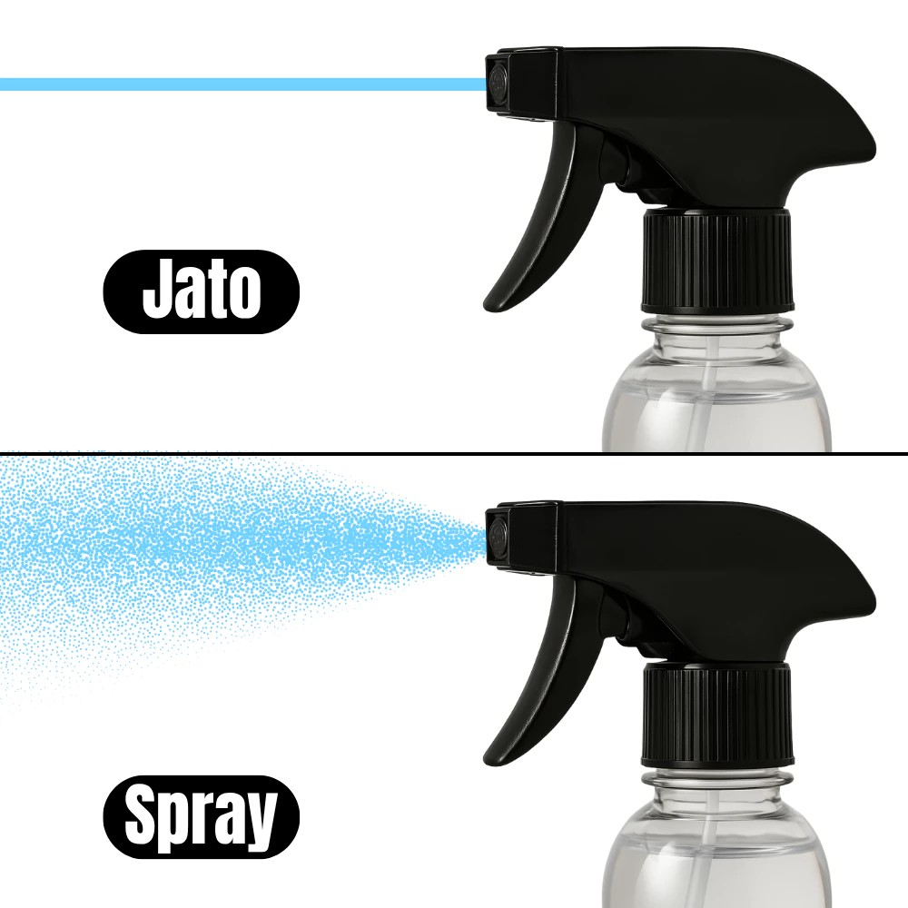 O bico rotativo dos borrifadores 500ml alterna entre spray fino, jato concentrado e posição fechada. Isso significa que o mesmo frasco serve para múltiplos produtos da sua linha: névoa para o aromatizador, jato para o desengordurante, spray para o multiuso. Você não precisa de embalagem diferente por tipo de produto — a tampa ajusta a aplicação.
